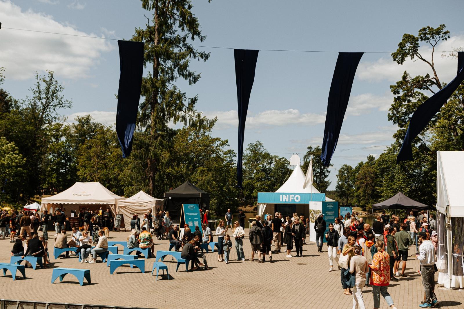 Āra pasākums, kurā cilvēki pulcējas ap teltīm ar uzrakstu "INFO". Zili soliņi un karogi rada dzīvīgu, svētku atmosfēru zem skaidrām debesīm.