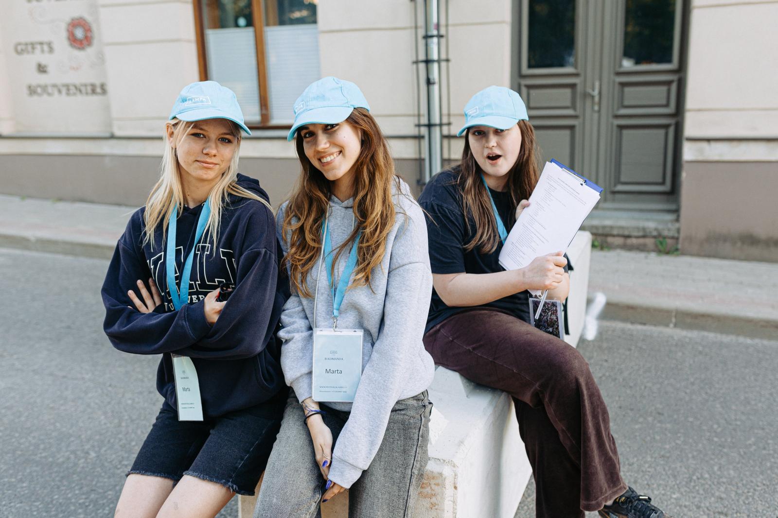 Trīs jaunas sievietes - festivāla brīvprātīgās -zilās cepurēs pozē ikdienišķi. Viena tur rokās planšeti.