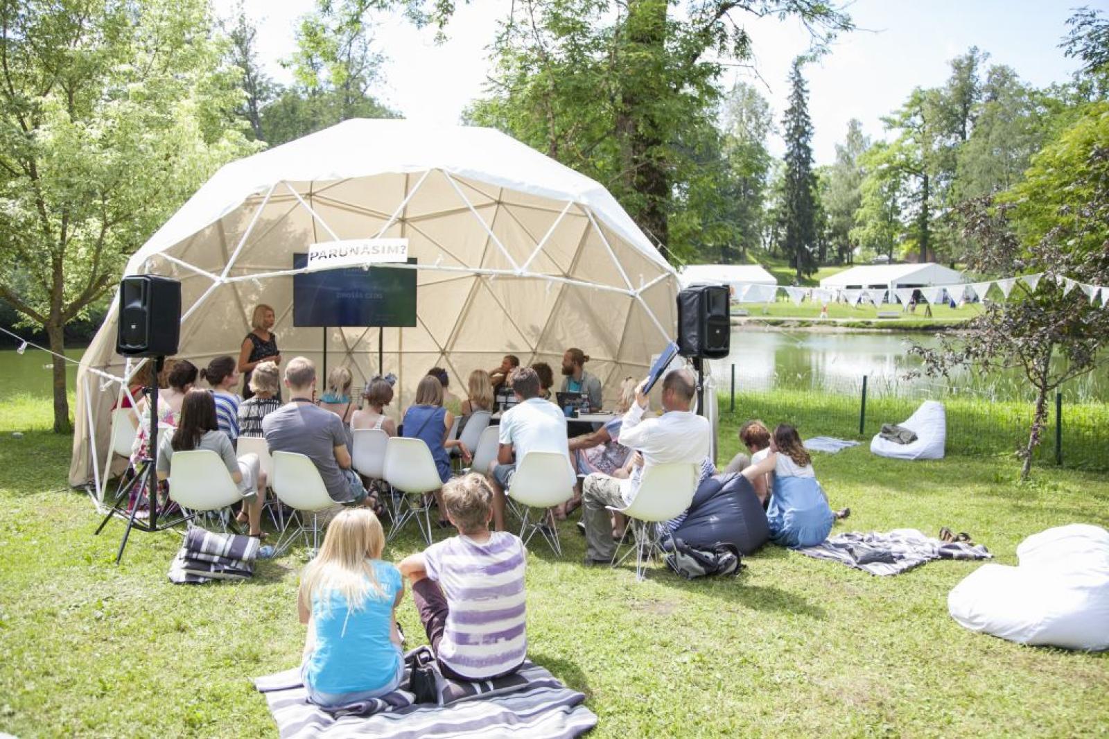Liels pūlis pulcējas zālienā netālu no vēsturiskās Cēsu pils pilsdrupām. Teritoriju ieskauj koki, radot dzīvīgu, svētku atmosfēru.