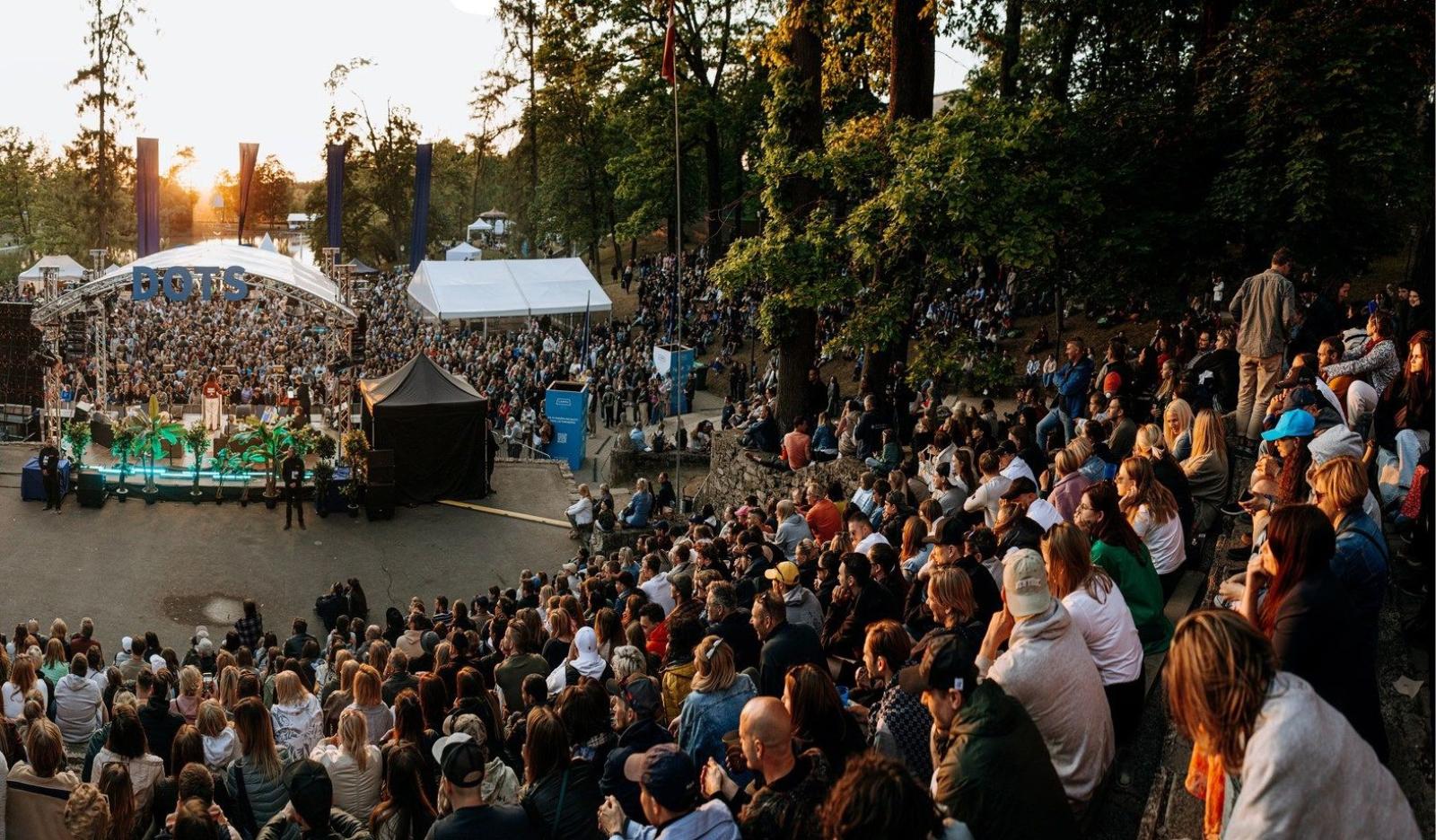 Liels pūlis pulcējas zālienā netālu no vēsturiskās Cēsu pils pilsdrupām. Teritoriju ieskauj koki, radot dzīvīgu, svētku atmosfēru.