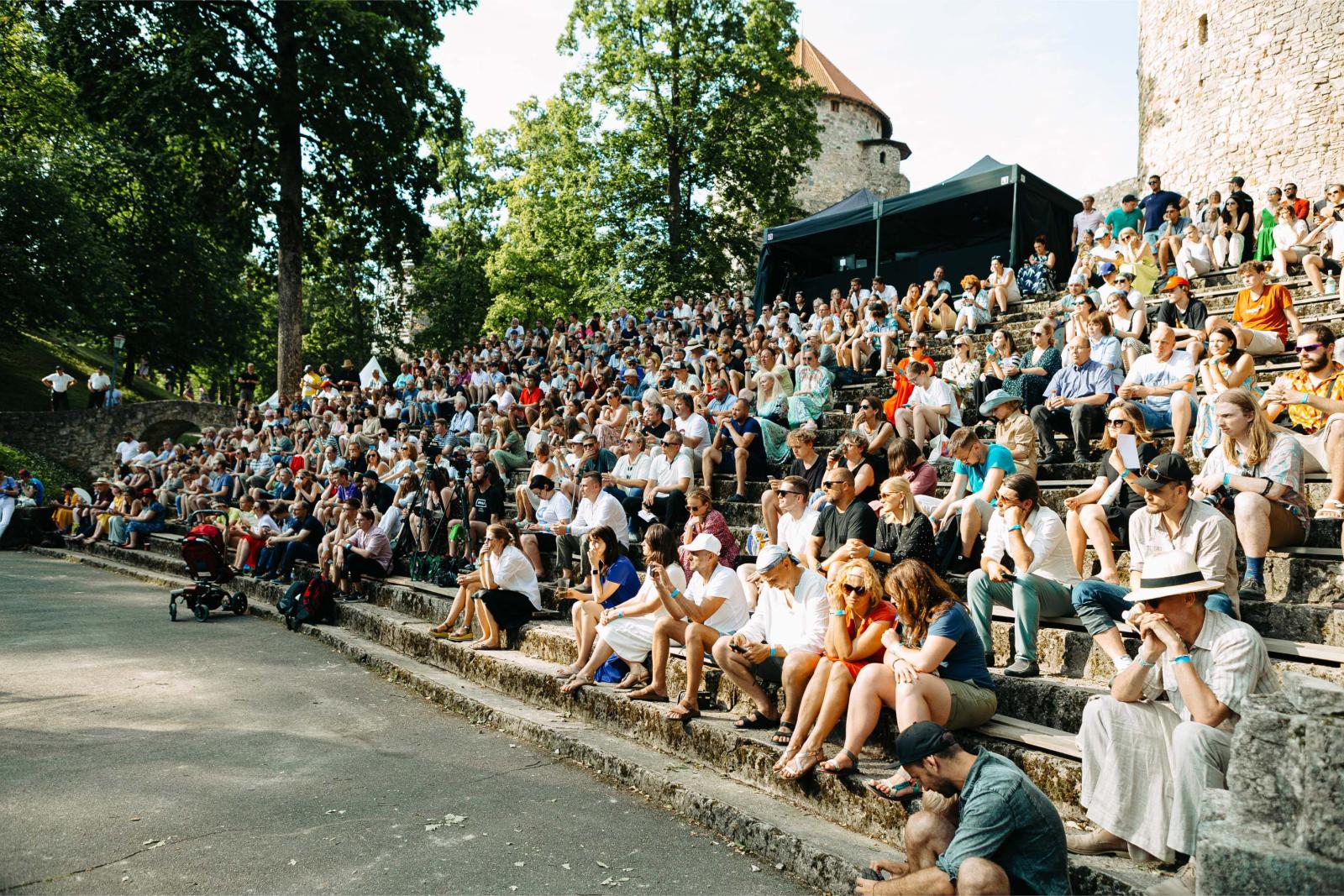 Liels pūlis pulcējas zālienā netālu no vēsturiskās Cēsu pils pilsdrupām. Teritoriju ieskauj koki, radot dzīvīgu, svētku atmosfēru.