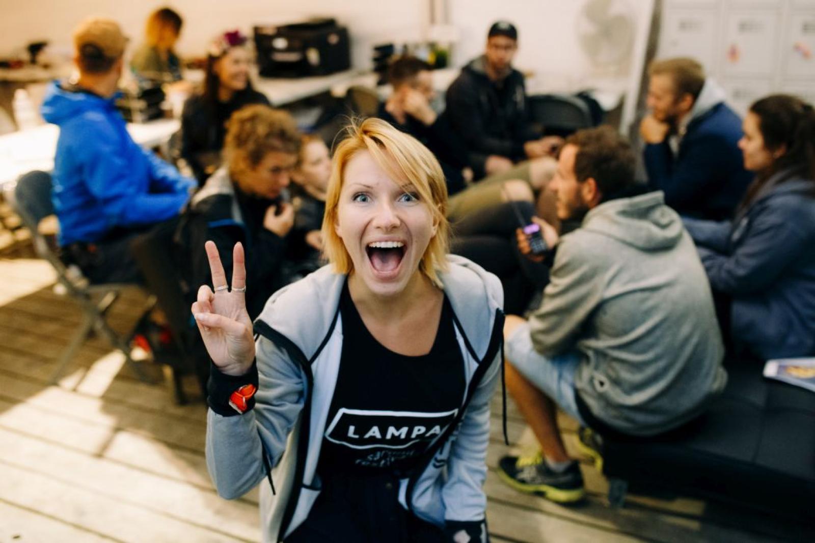Priekšplānā priecīga sieviete rāda miera zīmi, plati smaidot. Fonā cilvēku grupa mierīgi sēž, sarunājas un ir atslābinājusies.